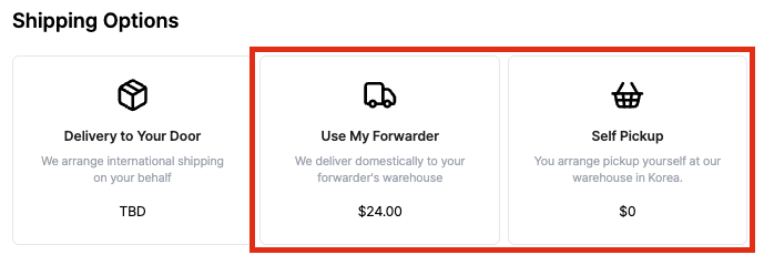 If you prefer to handle shipping on your own, you're welcome to use your own forwarder or arrange for a pick-up from our warehouse in Korea.